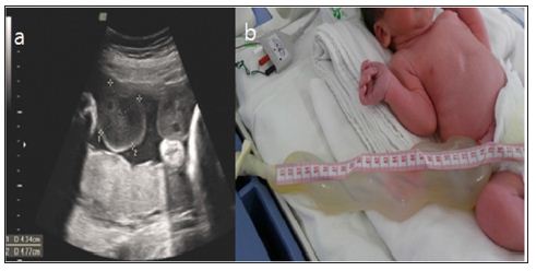 Figure 1: a. Prenatal ultrasonography image in the 34th week of gestation showing the dilated umbilical cord with edema and b. Postnatal findings of the neonate with a diffuse giant umbilical cord.