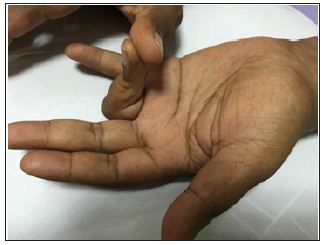 A 37-year-old male presented to our orthopaedic clinic with inability to extend his left ring finger. He previously diagnosed with left trigger ring finger and had surgical treatment to relieve the symptoms at another hospital centre 8 months before coming to our hospital. Post-operatively he was still unable to extend his finger (Figure 1). On physical examination, there was a swelling of 2x2cm found over the volar aspect of the forearm just proximal to the flexor retinaculum when the patient flexes his fingers. However on finger extension, the mass disappears. Due to prolong inability to extend his left ring finger he had developed a flexion contracture. Our working diagnosis was incomplete released of left 4th finger A1 pulley, TB tenosynovitis, followed by soft tissue neoplasmand subsequently surgical exploration was performed. We proceed with surgical exploration over the previous surgical scar over the A1 pulley of left ring finger. We noted that the A1 pulley has been completely released. However his finger was still in the flexed position. We decided to do an extended carpal tunnel incision to explore the mass proximal to flexor retinaculum. We noted whitish chalky infiltration of the Flexor Digitorum Superficialis (FDS) tendon, synovial adhesion to other tendons and hypertrophy of the flexor tendon (Figure 2 & 3). Synovectomy and excision of the chalky infiltration of the FDS tendon was performed. Histo-pathological evaluation confirmed the diagnosis of gout. Post-operatively, patient was able to extend his left ring finger but with some degree of stiffness but after 2 months of intensive physiotherapy he regained full range of movement to that finger.