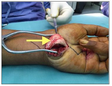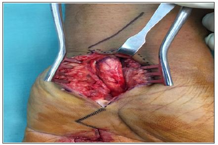 Figure 2: Classical carpal tunnel release done-noted whitish chalky infiltration of the tendon of the FDS, synovial adhesion to other tendons and hypertrophy of the flexor tendon.