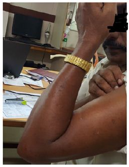A 44 year old right hand dominant male farmer patient sustained distal bicepital tendon rupture following a fall from tree while he was trying to cut a branch of tree and he lost control and fell down and tried to catch another branch of the tree to save himself and he heard a painful pop at that time and finally he fell on the ground. Fortunately he did not have any major fractures but noticed pain and swelling around the elbow. On the same day he presented to us. On examination swelling and ecchymosis in the distal arm and proximal forearm. Severe tenderness was noted. X ray of right elbow was normal and an MRI showed complete tear of distal biceps tendon. He was treated similarly as described in case one and biceps was reattached using fibre wire and suture anchor. Post operative protocol was also similar as case one and at 3 months follows up his quick DASH score improved to zero and he returned back to work.