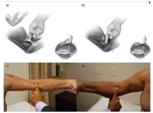 Figure 2: The hook test for distal biceps tendon, as described by O’Driscoll [6]. a. The normal test in which the examiner’s fingers can be hooked under the biceps tendon. b. The abnormal test, in which the examiner is unable to hook the distal biceps tendon. c. Demonstration of a normal hook test. As shown, a cord-like structure is felt under the index finger. d. Clinical picture demonstrating an abnormal hook test. The examiner is unable to feel the cord-like structure corresponding to the distal biceps tendon.