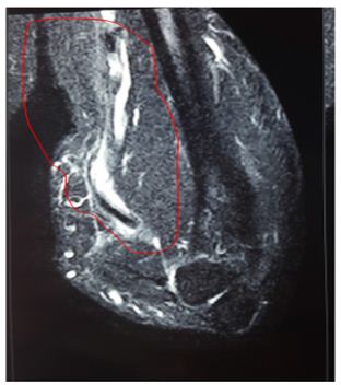 On ‘hook test’ (Figure 2) we could not hook finger around any anterior structures with elbow in flexed and supinated position. Pre operative quick DASH score was 57. X-ray showed no bony abnormality and an MRI confirmed complete rupture (Figure 3) and marked retraction of distal biceps tendon from bicipital tuberosity of the radius. Since the duration of injury was just one month we planned for reinsertion of tendon to bicipital tuberosity using fibre wire and an anchor screw. After pre anaesthesia evaluation patient was taken up for surgery. We went through anterior approach using a curved single incision over antecubital fossa without a tourniquet, and retrieved the tendon from the superior part of the incision (Figure 4).