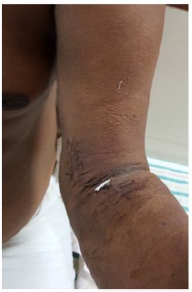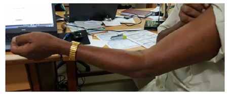 63 year old left dominant handed male patient sustained injury to left elbow at work site one month before he presented to us,- while he was trying to cut a banana tree it was about to fall on his feet, while he tried to catch the tree before it fell. He had a painful ‘pop’ at the time of injury. He noticed painful range of movement of left elbow and difficulty in using left elbow. Initially he consulted an orthopaedic surgeon and was managed with a sling and analgesics, when he presented to us he had developed painful restriction of range of movement and was so unhappy about the initial treatment. On inspection there was flattening of the distal contour of the arm as compared to opposite arm (Figure 1), mild tenderness at anticubital fossa. He had weakness of flexion and supination.